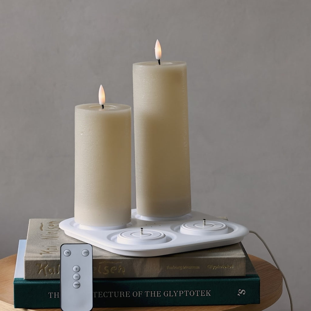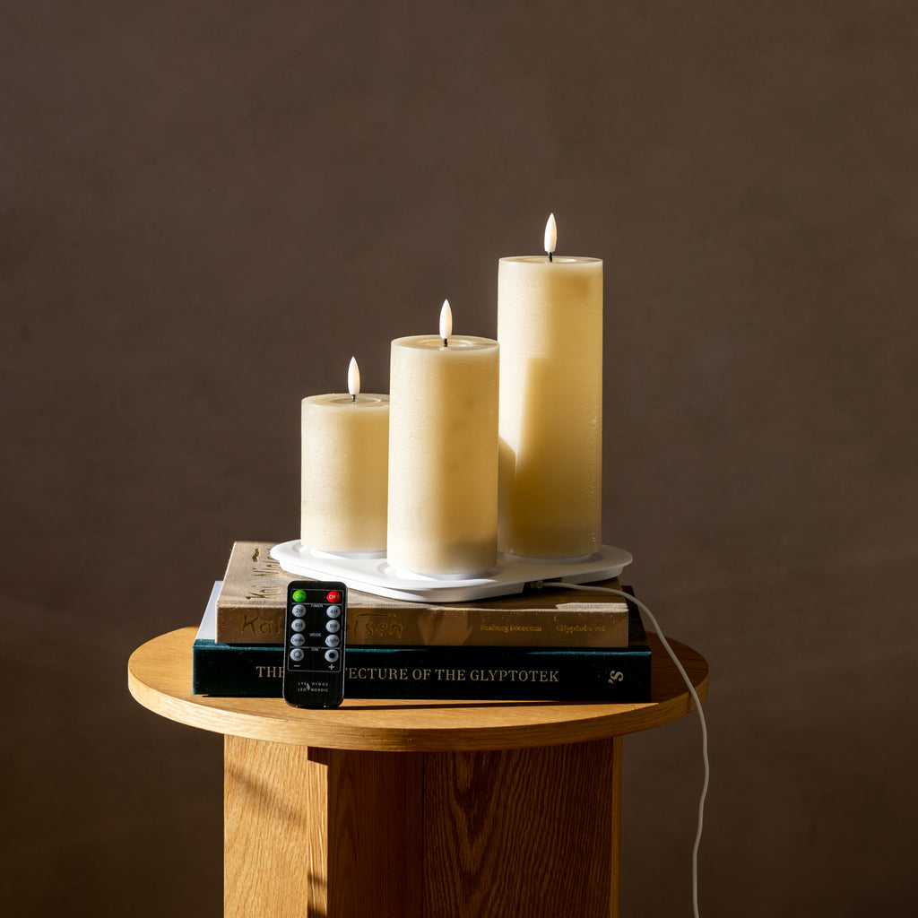 Dette er en komplett «hyggepakke» med LED-lys, ladeplate og fjernkontroll.